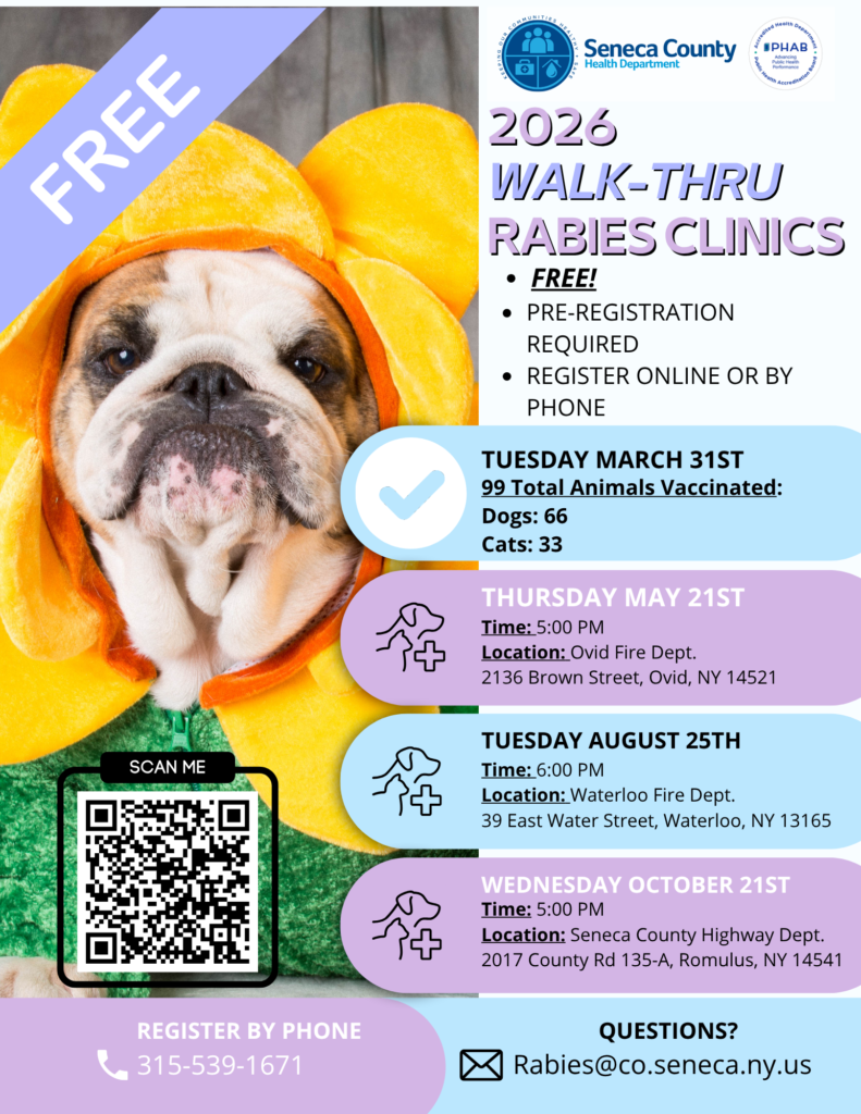 For more information on rabies and rabies prevention contact the Seneca County Health Department at (315) 539-1945 or click here to visit the NYS DOH web site.